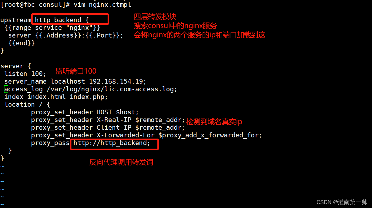agent(代理):用来控制consul template模板,用template组件去和nginx.conf来进行对接,模板里全是变量,用变量的方式去加载后端由注册到consul server端之后,server端会把信息告诉agent,agent和template进行对接,写入template,template就有了镜像,更新完之后会作为nginx.conf子配置文件被前端的nginx识别,consul agent会控制reload之后会识别nginx.conf配置文件中的变化,相当于识别后端的节点,就可以在地址池中动态调整自己后端资源