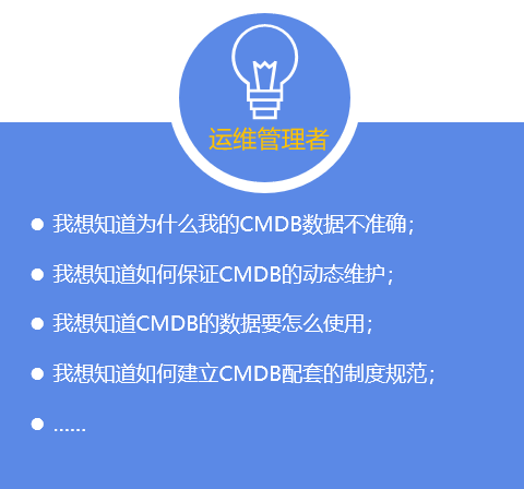 对于运维管理者或者运维经理等角色,更关心CMDB落地为企业带来的价值,CMDB建设是一个长期的过程,运维管理者需要让这一高成本建设,能够合理的使用起来,保证数据的准确性,提供业务价值。