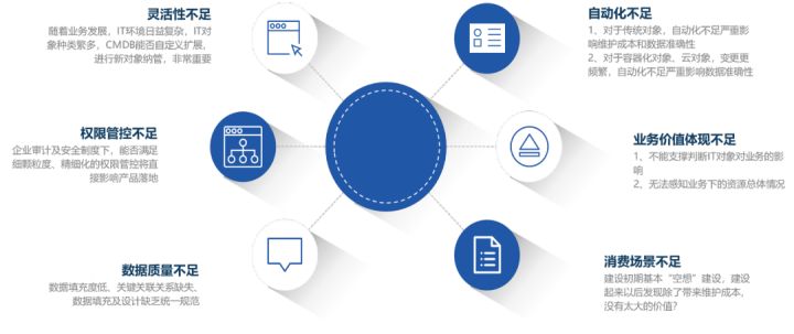 主要还是体现在早期以“资产”为中心的CMDB中,由于无法呈现IT对象与业务之间的关系,不能够有效支撑判断IT对象对业务的影响,同时无法感知业务下的资源总体情况,CMDB模型设计层面如果无法支持端到端,没有完整的拓扑呈现的话,是没办法随着运维自动化、智能化的发展去体现它作为IT运维平台的基石的价值的。