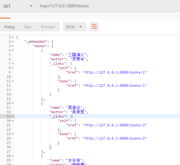 如果要分页或者排序查询,可以使用 _links 中的链接。http://127.0.0.1:8080/books?page=1&size=3&sort=id,desc 。