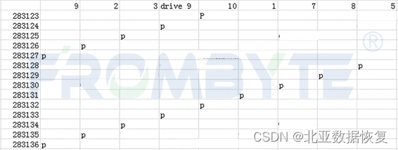 服务器数据恢复工程师对该服务器raid进行分析搞清楚条带大小为1024个扇区。按照1024扇区分割,使一个记录为一个条带的大小,如下图所示,7块盘跳到同一记录283123。