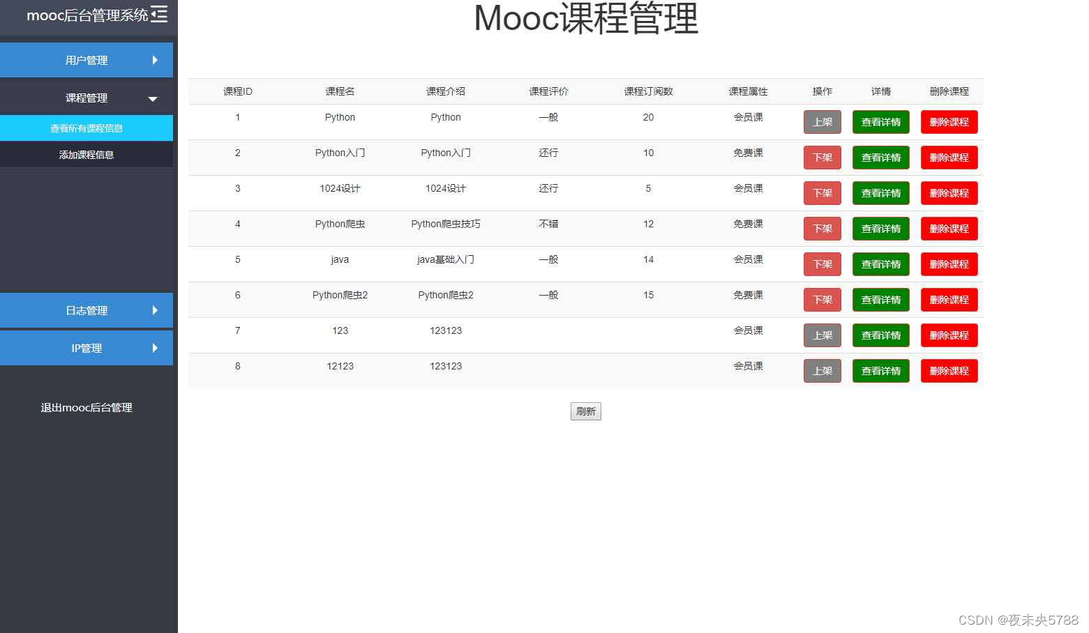 本模块包括用户管理,作品信息管理等。 用户管理:提供管理员查询用户,锁定解锁用户,修改用户信息,充值余额。 课程信息管理:提供管理员增加删除修改功能。 系统日志查看:查看所有系统的动作信息。 访问ip管理:提供对访问IP的管理,可以进行拉黑IP等操作。