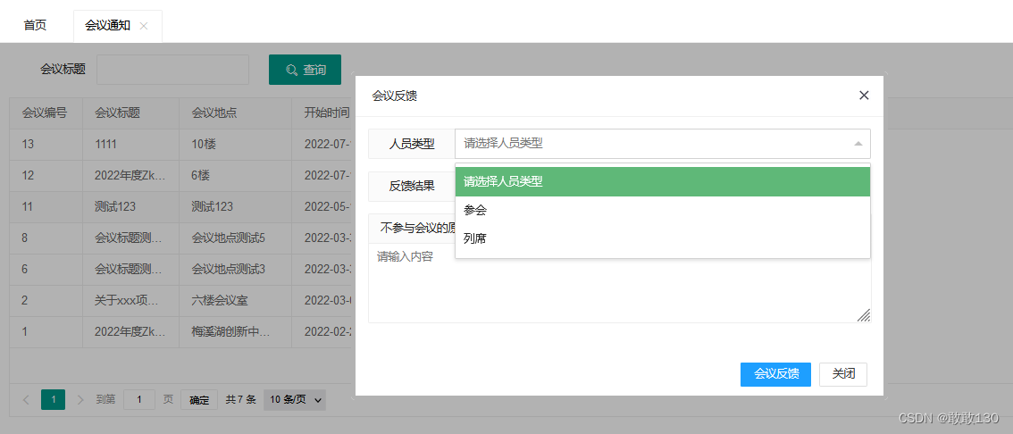 然而上面那条数据应该还要带上条件,是什么状态,肯定是待开,因为审核通过了,所以是待开状态 状态:0取消会议 1新建 2待审核 3驳回 4待开 5进行中 6开启投票 7结束会议,默认值为1