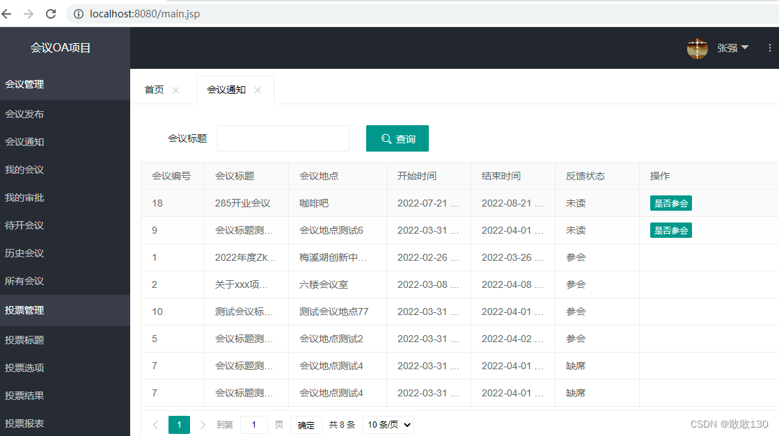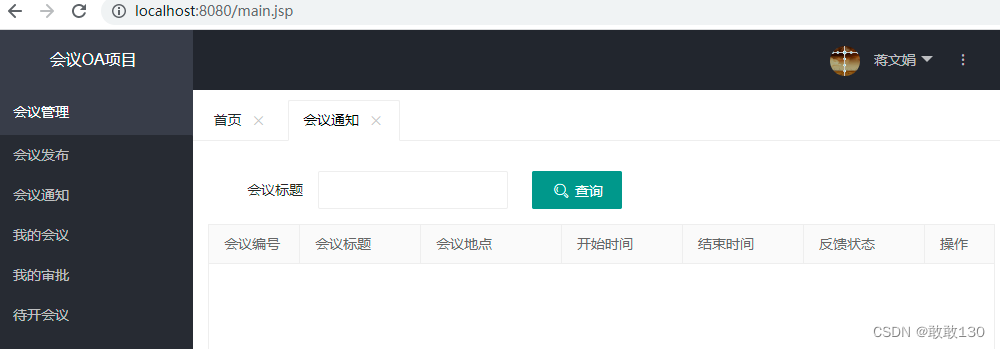 我们最终目标查询出数据,就是说登录一个账号,只要这条会议有你的名字就要查询出来,如果说我没有反馈,然后不管我反馈和没有反馈这条数据都要查询出来,三种状态,一个是未读、就是不反馈,二是反馈了,不参加,三是反馈了,会参加,然后反馈了什么就要在反馈状态上显示你是未读或者参加与不参加