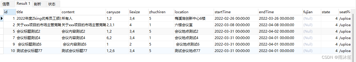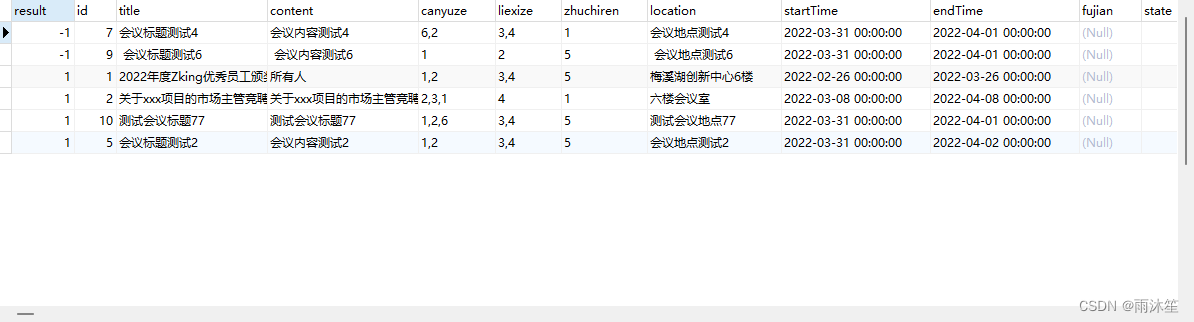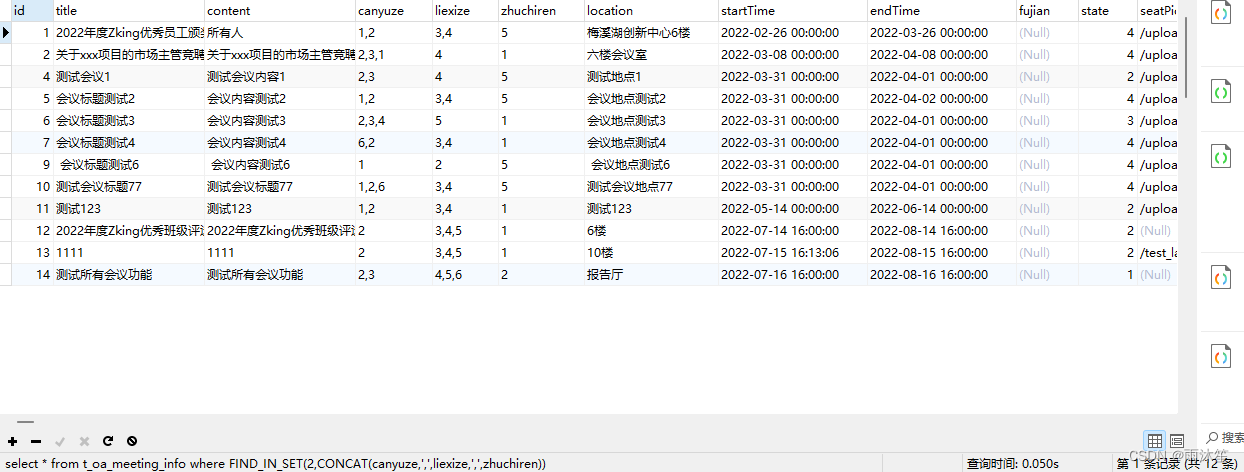 select * from t_oa_meeting_info where FIND_IN_SET(2,CONCAT(canyuze,',',liexize,',',zhuchiren))根据以上SQL语句可以查询出参与者、列席者、主持人中包含id=2的所有会议