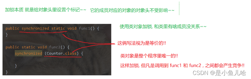 - synchronized (object1) { // 针对object1对象来进行加锁,加锁操作是针对一个对象来进行的