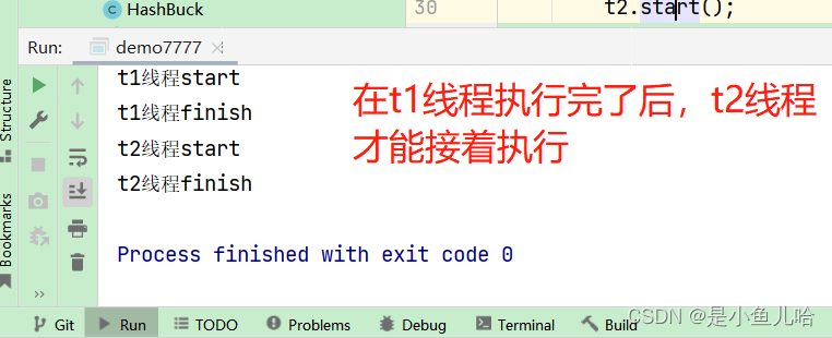- t1.join();// 等t1线程执行完了,t2线程再执行