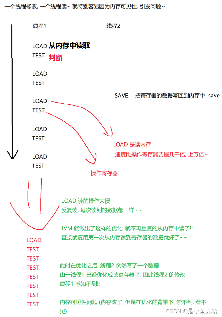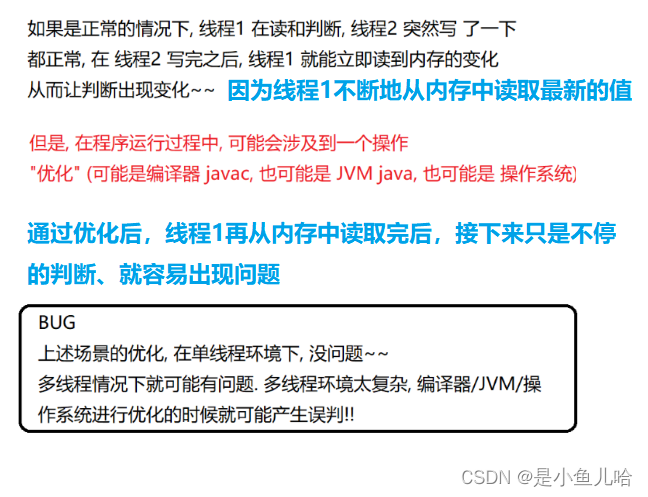 是操于作系统就发现,怎么回事,这个flag值一直也没有改变,那么t1线程一直不断地从内存中读取flag的值,这样的效率是很低的。于是操作系统就对这种情况进行了优化,t1在第一次从内存中读取flag的值后就不再反复的从内存中读取了,接下来只是不断地进行判断——也就是说:在t2线程把flag的值更改了后,t1线程并没有成功读取到更改后的flag值。