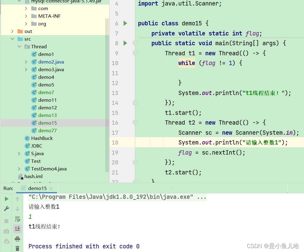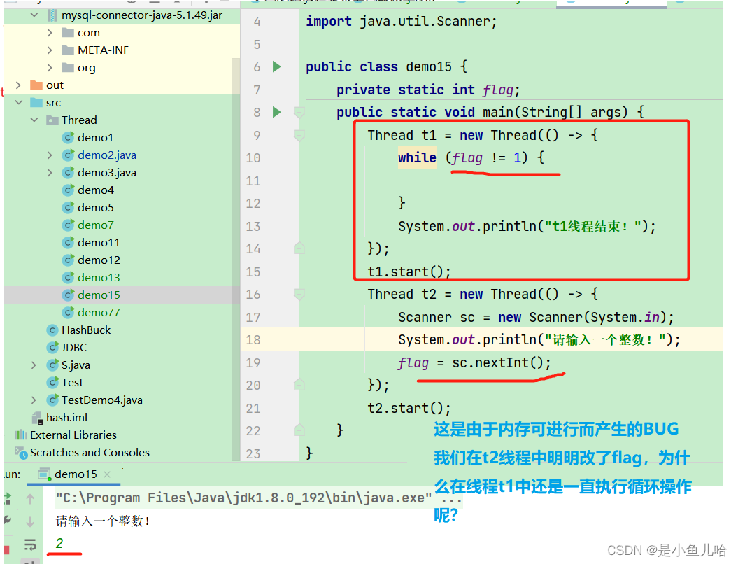但我们的t1、t2创建好了后,操作系统内存对我们这两个线程进行随机调度执行。那么我们的t1线程在执行过程中就不断地从内存中读取flag的值,然后进行判断。那么就有可能t1线程在执行了好长一会后,t2才执行、输入了一个整数&&改变了flag值。