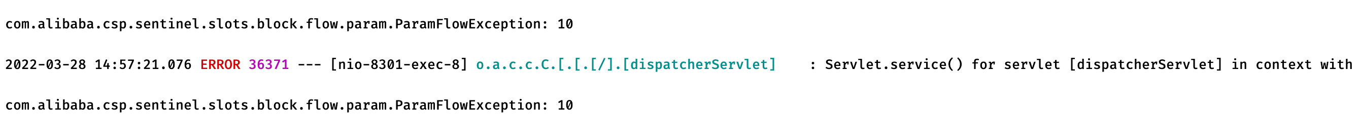 然后开始访问我们的测试接口,可以看到在携带参数a时,当访问频率超过设定值,就会直接被限流,这里是直接在后台抛出异常: