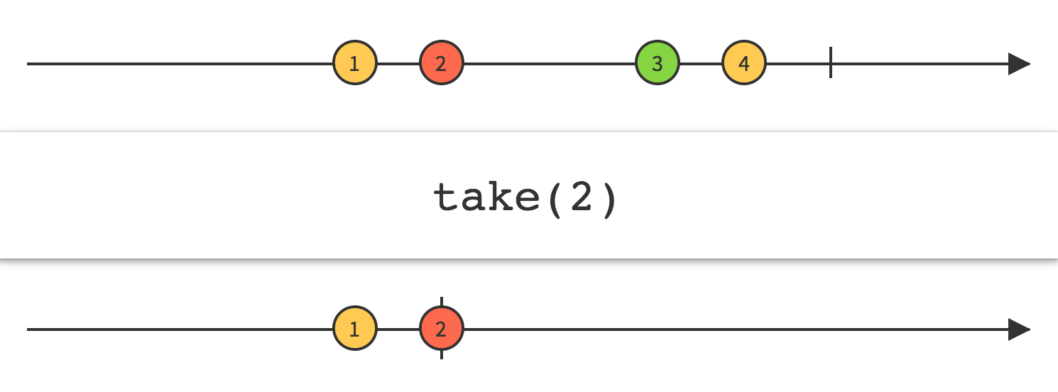take(int)用一个整数n作为一个参数,只返回原始的序列中前N项数据,然后发射完成通知,忽略剩余的数据。