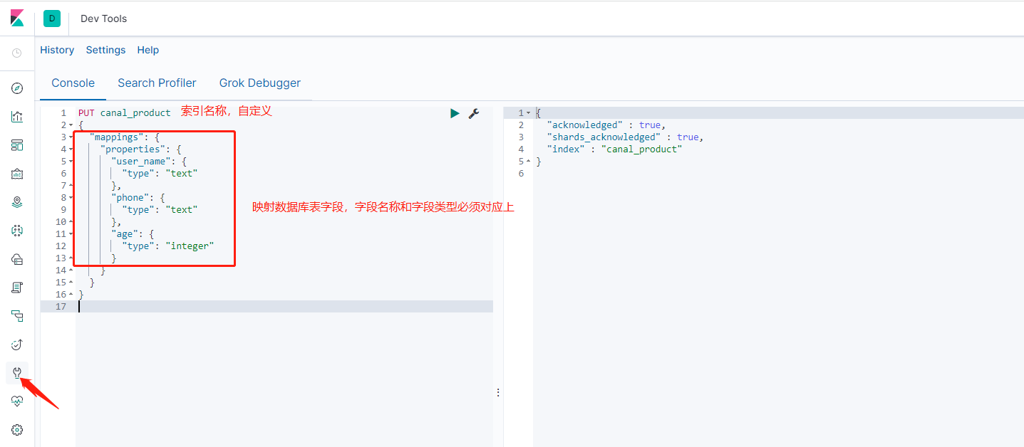 PUT canal_product { "mappings": { "properties": { "user_name": { "type": "text" }, "phone": { "type": "text" }, "age": { "type": "integer" } } } }