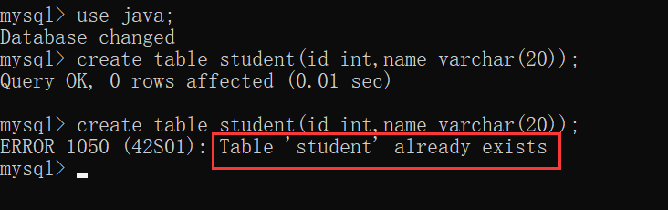 同一个数据库中,不能有两个表 名字相同,否则会出错~~