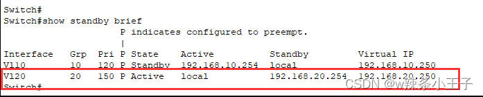 - standby 20 priority 120 #指定vlan20虚拟路由组号为20的优先级为120,说明他是备份的