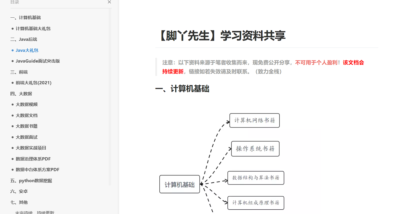 整篇文档按照技术方向分为 计算机基础,java后端,前端,大数据,Python数据挖掘等等 。