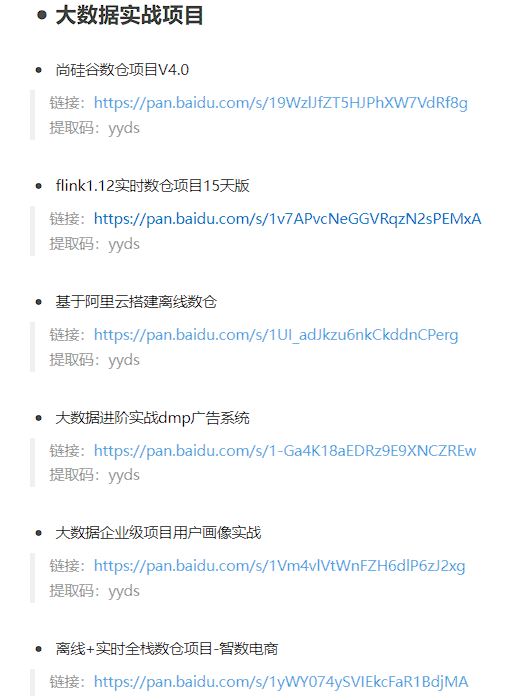 对于大数据的小伙伴来说,希望在项目实战部分,精选一个,弄懂,弄深入即可,人的精力的有限的,不要贪多。