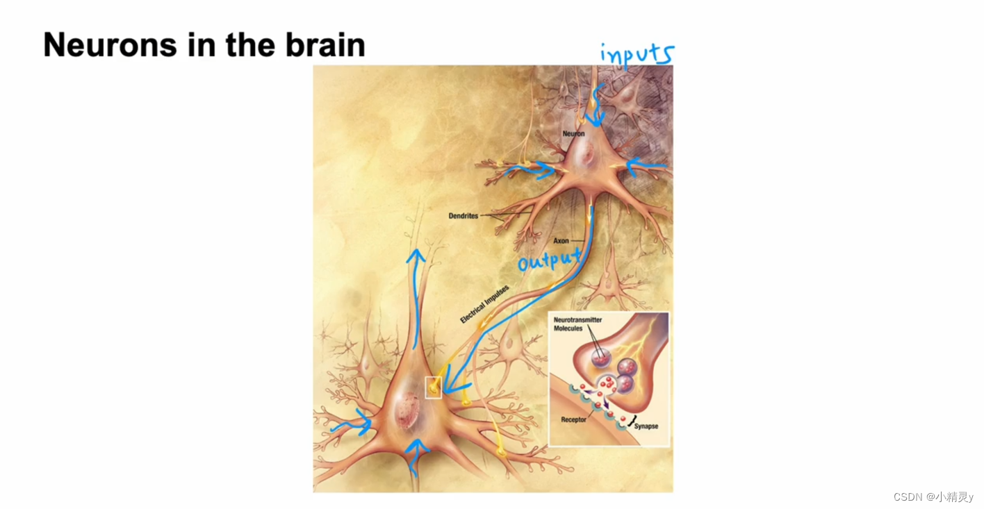 人类所有的思想都来自下图这样的神经元发送电脉冲,有时会形成其他神经元的新连接。给定这样的一个神经元,它获得来自其他神经元的电脉冲,然后执行一些计算后将发送此输出,通过电脉冲传送给其他神经元,然后这个上层神经元的输出依次称为下层神经元的输入,下层神经元再聚合多个其他神经元,然后将其自己的输出发送到其他神经元,这样就构成了人类的思想。
