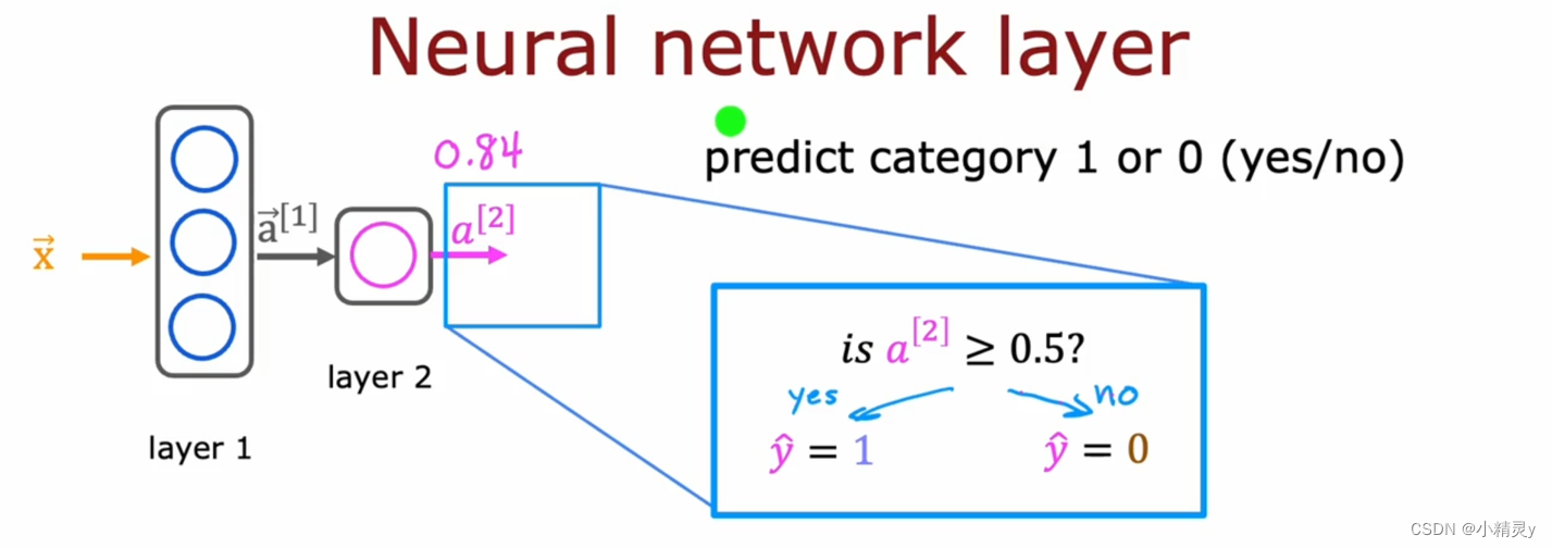 为了简化这个神经网络,将这四个输入特征写成向量x_,这个特征向量被馈送到中间的这一层,然后计算三个激活值,这三个激活值在成为另一个向量a_,这个向量被馈送到最终的输出层,最后输出概率。