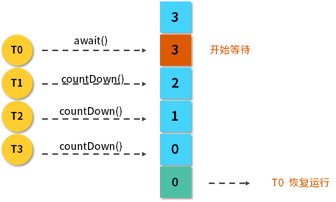 如下图所示, CountDownLatch 设置的初始值为 3,T0线程调用await 方法进入等待,T1、T2、T3每一次调用 countDown 方法,内部的计数器依次减1,计数器为0时,T0线程恢复运行。
