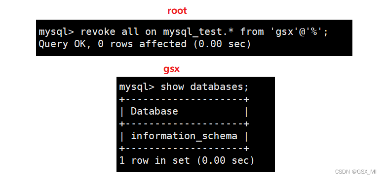 (1)给用户gsx赋予mysql_test数据库下所有文件的select权限,赋完权就能看到新的表了