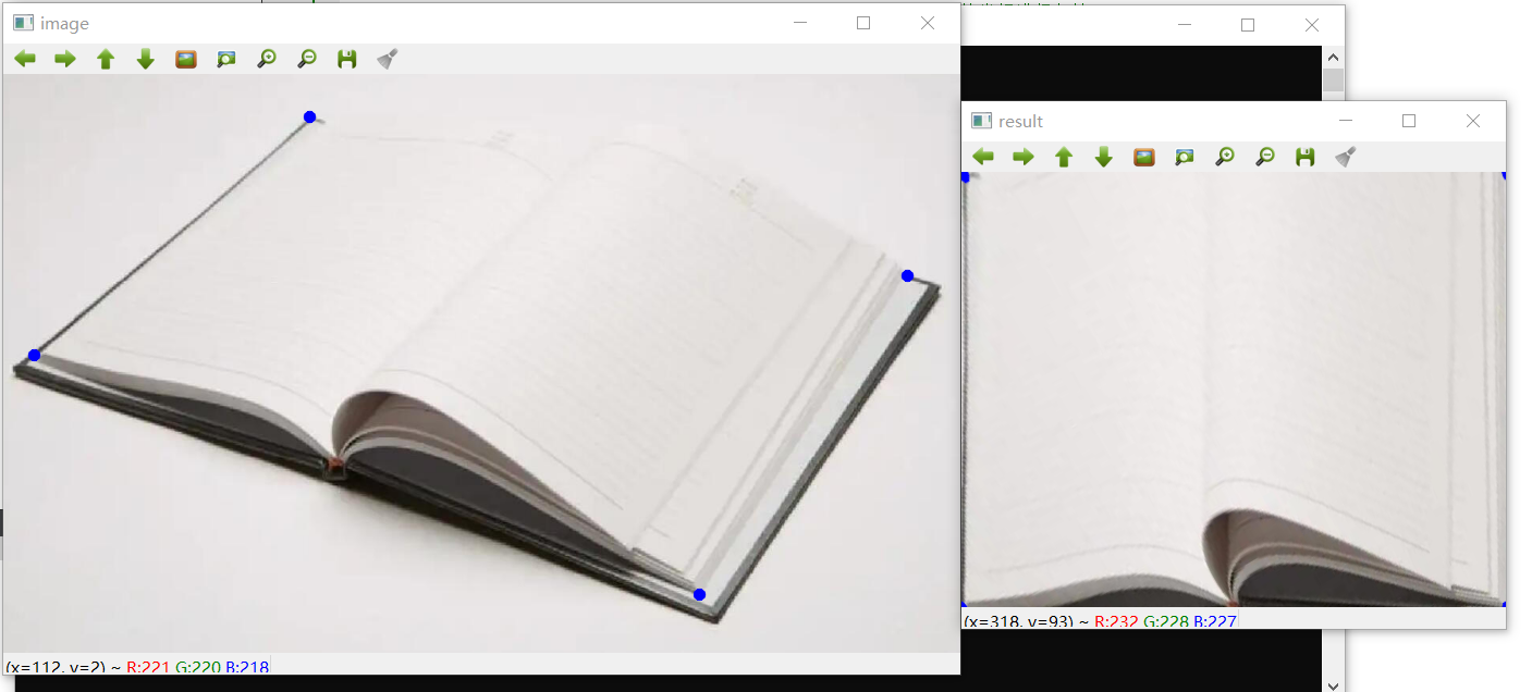 书本视图矫正完整代码如下:【这里是鼠标点击从左上角开始顺时针选取4个点透视变换】