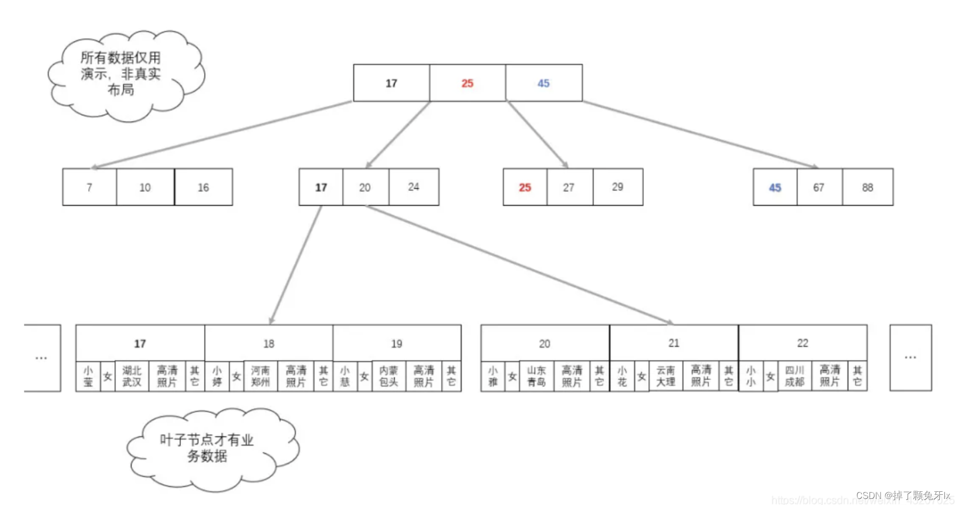 将所有的数据存储(载荷)都放在叶子节点上,因为数据中索引和数据是分离的,所以我们要把真实的存储数据换成所在地址。