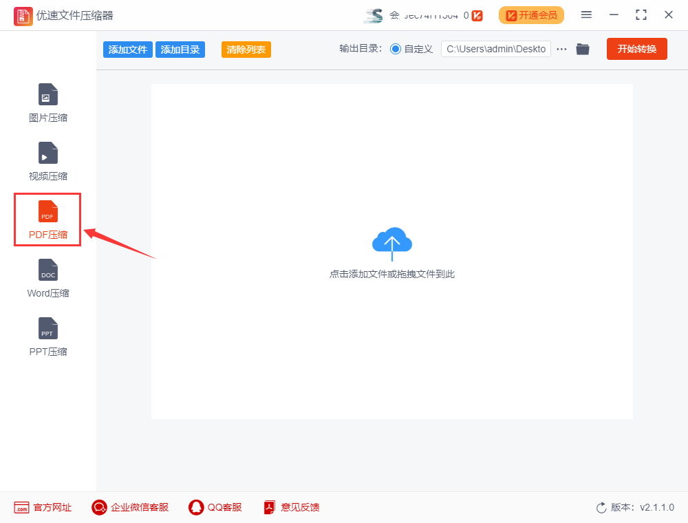 步骤1,先在电脑上下载“优速文件压缩器”软件工具,安装好之后打开使用。可以看到软件一共支持五种文件的压缩,我们点击【PDF压缩】进入下一步。
