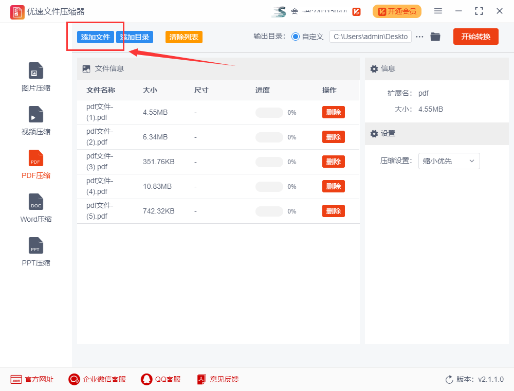 步骤4,最后我们点击右上角的【开始转换】红色按键,启动文件压缩程序,完成压缩后软件会立即自动打开输出文件夹,方便我们查看和使用压缩后的pdf文件。