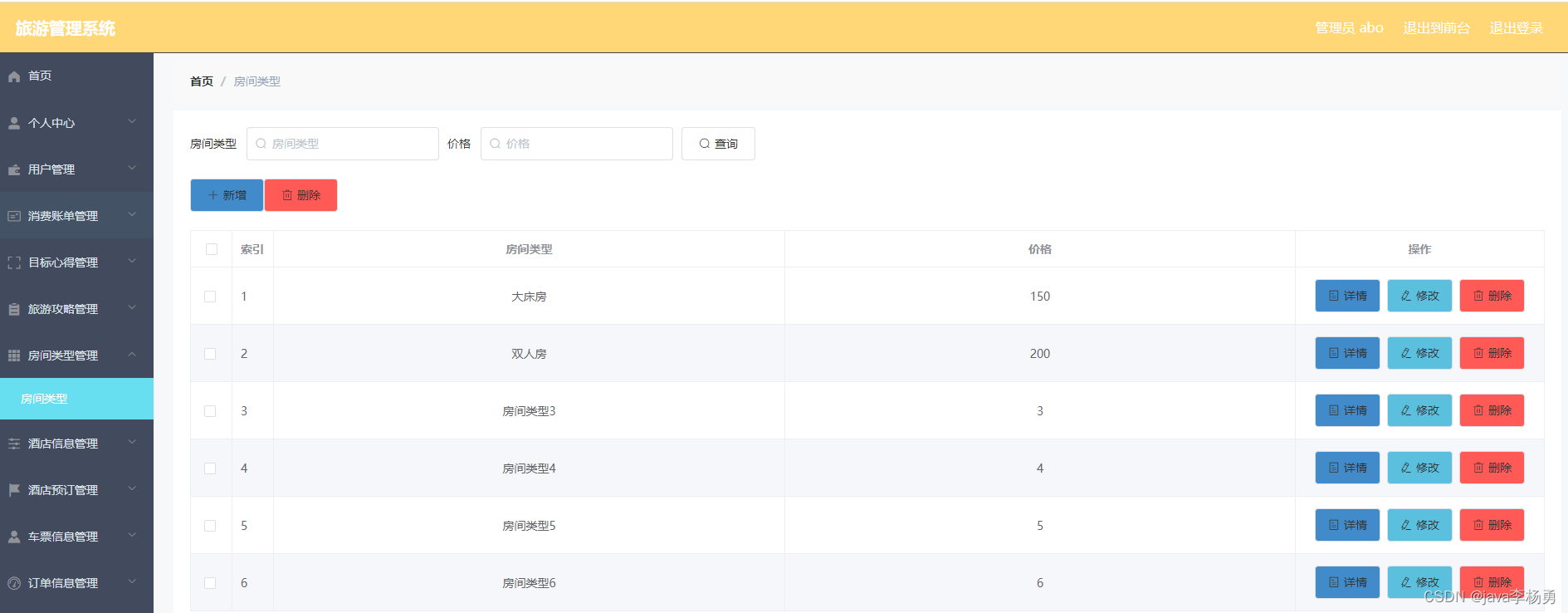 然而管理员则可以在后台直接管理;首页、个人中心、用户管理、消费账单管理、目标心得管理、旅游攻略管理、客房预订管理、房间类型管理、酒店预定管理、酒店订单信息管理、车票信息管理以及系统管理等信息。本网站模块设计的独立性强,用户体验良好、后期维护修改管理十分方便。