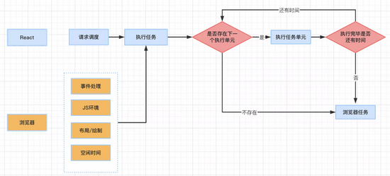 可以看到,React 首先向浏览器请求调度,浏览器在执行完一帧后如果还有空闲时间,会去判断是否存在待执行任务,不存在就直接将控制权交给浏览器;如果存在就会执行对应的任务,执行完一个新的任务单元之后会继续判断是否还有时间,有时间且有待执行任务则会继续执行下一个任务,否则将控制权交给浏览器执行渲染,这个流程是循环进行的。
