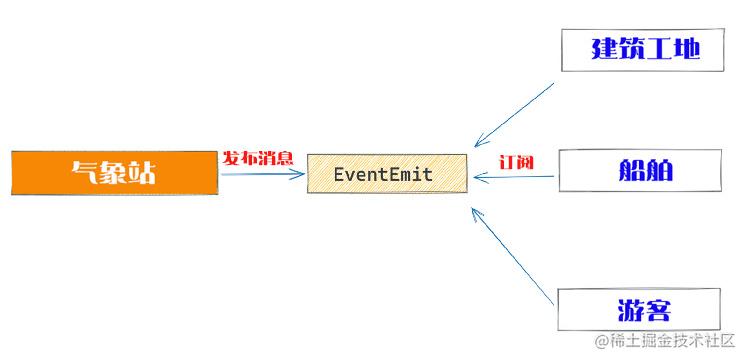 气象站发布通知,然后触发事件,建筑工地、船舶和游客订阅该事件。气象站不需要关心哪些对象关注天气预警,只需要直接触发事件即可。然后需要了解天气状况的单位主动订阅该事件。