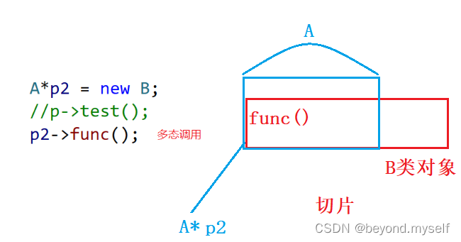 (2)示例2:假设B是子类,A是父类,new一个B类的临时对象,然后把这个临时对象赋给一个父类指针A* p2,通过这个父类指针p2就可以访问子类B的虚拟函数func