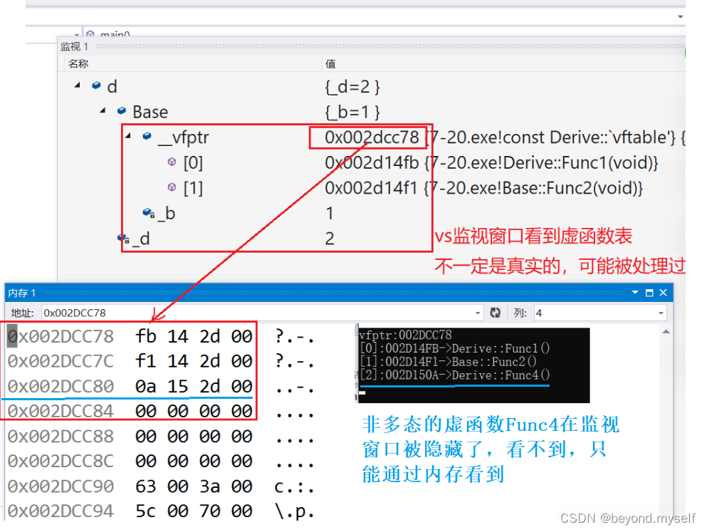 (5)非多态的虚函数Func4在监视窗口被隐藏了,看不到,只能通过内存看到
