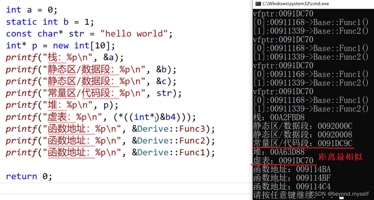 可以存在静态区或者常量区,最可能存在常量区。通过下面打印地址可见虚表存储地址离常量区地址最近