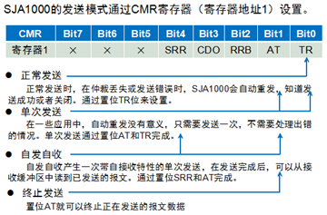 char SetSJASendCmd(unsigned char cmd) {unsigned char ret;switch (cmd) {default:case 0: ret = SetBitMask(REG_CAN_CMR, TR_BIT); //正常发送break;case 1: ret = SetBitMask(REG_CAN_CMR, TR_BIT|AT_BIT); //单次发送break;case 2: ret = SetBitMask(REG_CAN_CMR, TR_BIT|SRR_BIT);//自收自发break;case 0xff: ret = SetBitMask(REG_CAN_CMR, AT_BIT);//终止发送break; }return ret;}