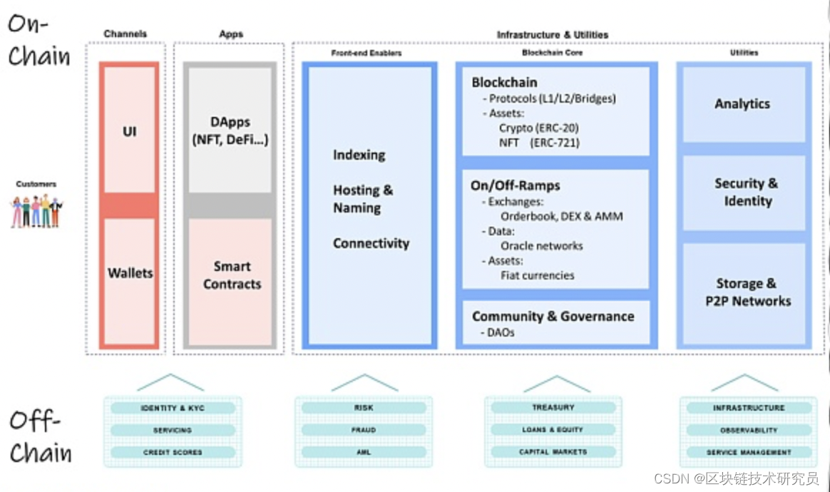 这里是分布式应用(DApps)和智能合约的逻辑部分,以满足越来越多的使用案例。它们与底层基础设施交互,并通过渠道(Channels)支持用户交互。就像基础设施组件一样,DApps 和智能合约需要在某个地方运行;因此,依靠区块链和各种 "链外 "服务提供者来确保功能性和非功能要求得到满足。