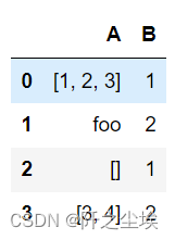 - df = pd.DataFrame({'A': [[1, 2, 3], 'foo', [], [3, 4]], 'B': [1,2]*2})