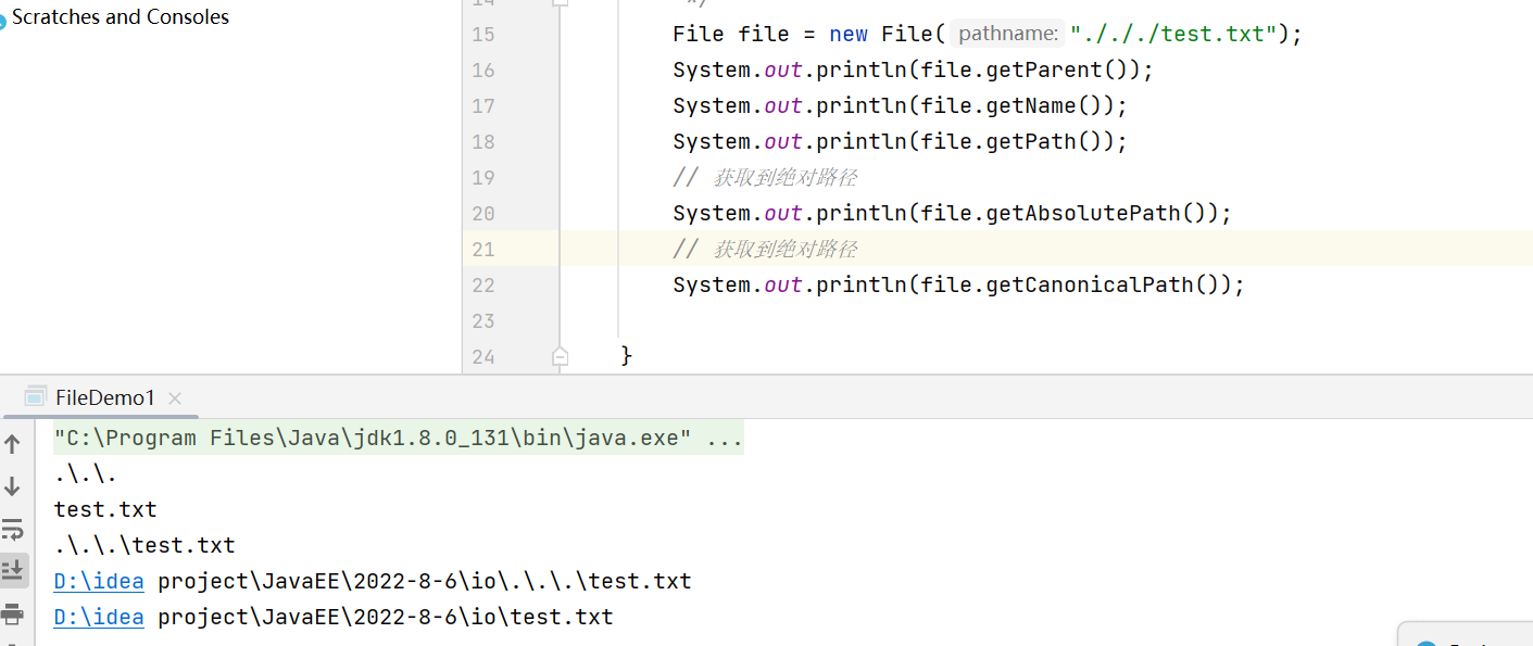相对路径:一般以. 或者.. 开头,以工作目录为基准,去找相对应的路径。如果以D:\idea project\lianxi\test\src为基准目录,此时要表示src中的FileDemo1.java,相对路径就可以写作 .\FileDemo1.java,此时.就表示当前的基准目录D:\idea project\lianxi\test\src。