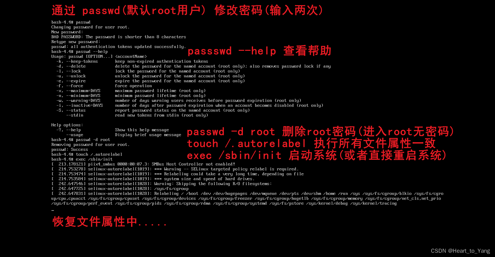 touch /.autorelabel 执行所有文件属性一致,此命令必须执行否则 密码校验值会不通过 导致开机后输入正确的用户名和密码 无法进入系统