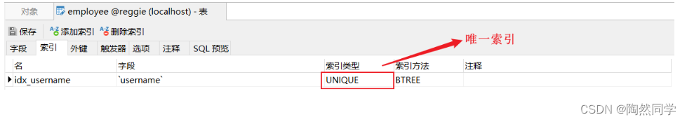 需要注意,employee表中对username字段加入了唯一约束,因为username是员工的登录账号,必须是唯一的。