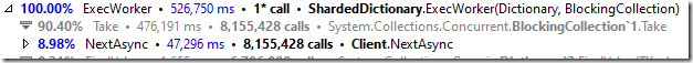 分析器的结果表明,我们这最大的开销就是ConcurrentDictionary的可伸缩性。即使我使用了1024个分片的锁,它仍然占用50%的时间开销。问题是,我们能做得更好吗?我们可以尝试一个更好的选择,就是我们不再使用ConcurrentDictionary,而是直接使用单独的Dictionary来分片,这样的话每个Dictionary都不需要并发就可以访问。