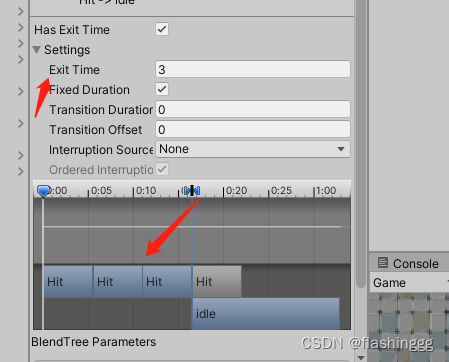 不依赖参数过渡,依赖指定的具体时间Exit Time进行过渡,选中之后Setting中可以设置具体时间。