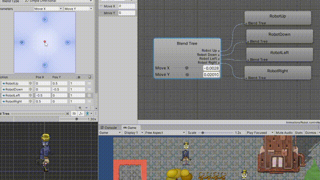 这里就用到了2DBlend Tree,变量分别为float类型的x、y表示x方向和y方向的移动速度。由于当前Robot走路有四个朝向,就创建4个Motion,对(x,y)分别赋予不同的值。