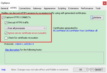 其中,“Capture HTTPS CONNECTs”表示抓取HTTPS数据包,“Decrypt HTTPS traffic”表示对HTTPS数据包进行解码;“from all proceses”表示抓取所有进程的数据包;“Ignore server certificate errors(unsafe)”表示忽略服务器证书的错误。最后点击“OK”按键,此时Fiddler不但可以抓取HTTP协议的数据,还可以抓取HTTPS协议的数据了。