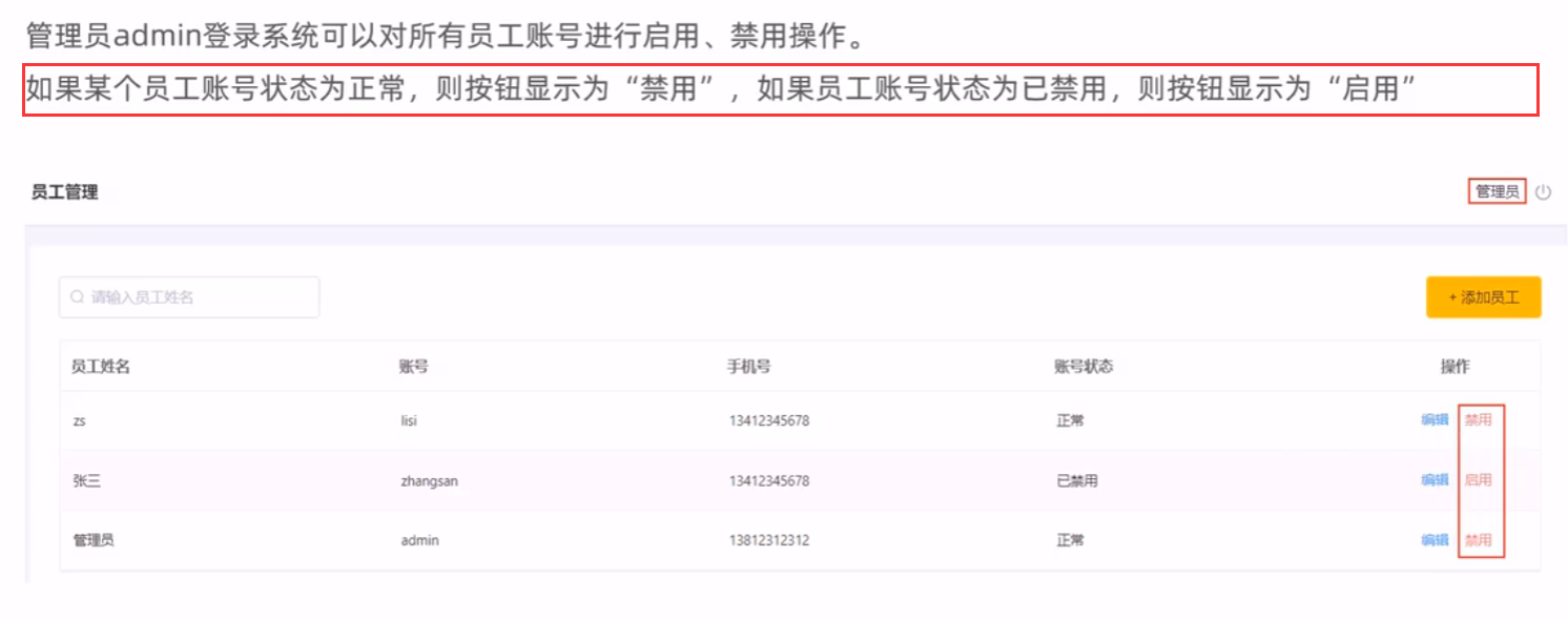 启用、禁用员工账号,本质上就是一个更新操作,也就是对status状态字段进行操作