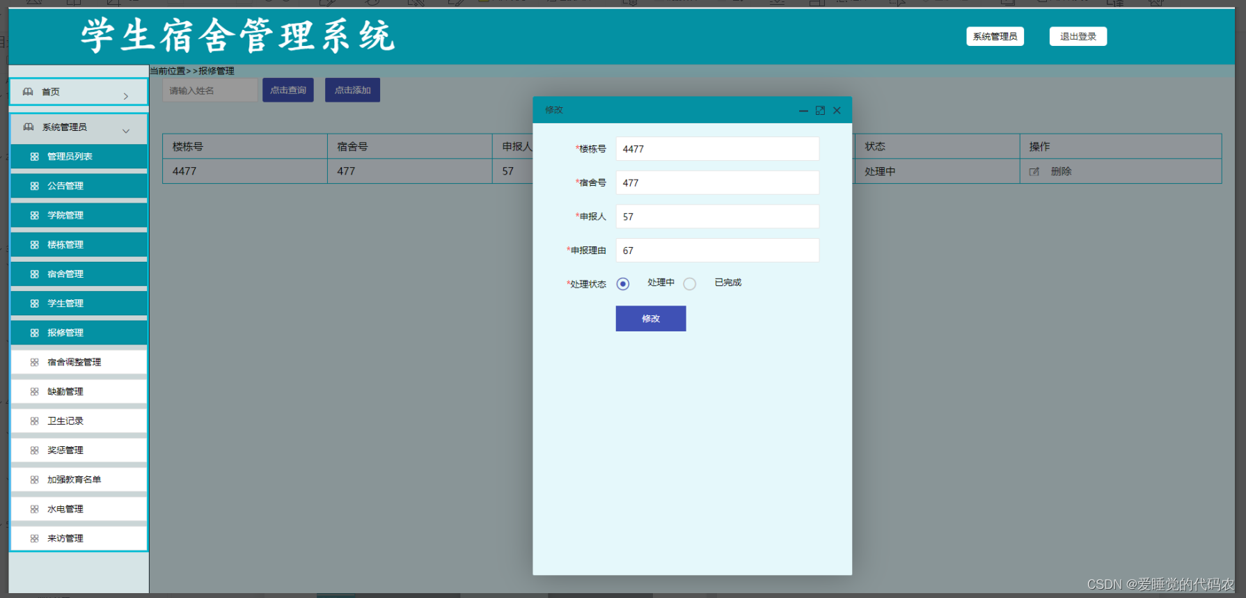 楼栋编号、学院编号、类型、房间总数、床位总数等信息的删除、修改、新增、查询功能,如下图5-5所示。