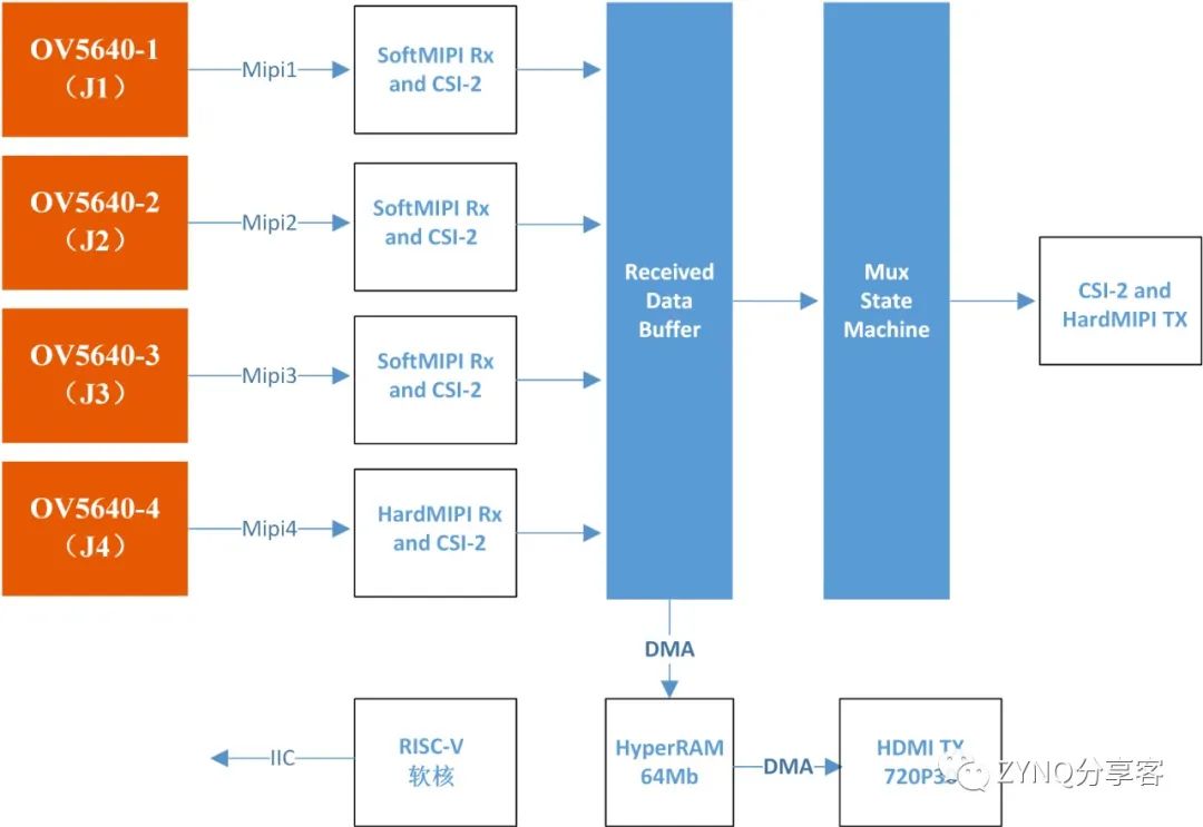 实现该需求的系统软件框图见上图1所示。通过一个RISC-V控制IIC外设配置四颗OV5640 Sensor使之输出720P30的YCbCr4:2:2图像,FPGA接收MIPI数据后经过缓存后通过一个MUX状态机将之合成到不同的VC通道上并通过HardMIPI接口发出。另外,可从四路sensor中选择一路图像经HyperRAM缓存并通过HDMI接口显示到电视上(备注:因输出为720P30图像,故可能大多数的显示器都不支持,但电视是可以直接显示的)。