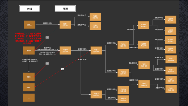 B代理和C代理也升级成为老板了,那么他们的身份跟A老板达成了一致,平台会额外补贴给上级老板(A老板)奖励,例如B老板直推了一个代理将获得300元收益,平台设置的平级奖励为10%,那么A就能获得30元平级奖励)。