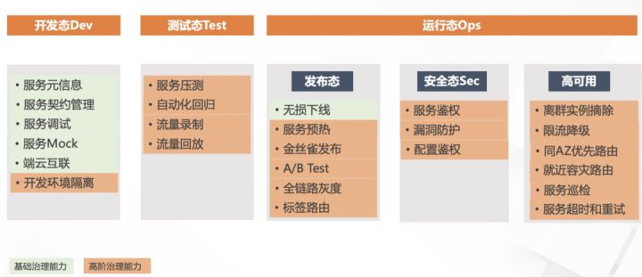 在介绍升级能力之前,先简要回顾 MSE 产品的核心能力,分为开发态、测试态及运行态,其中在服务治理中较为常用的功能包括无损上下线、全链路灰度以及日常环境隔离三大功能。