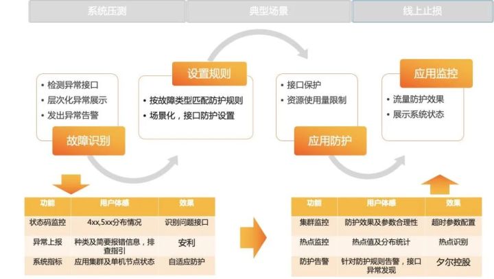 对应流量治理模型在流量防护方面形成可拓展闭环,围绕系统线上环境可能出现的各种问题,进行有效治理。模型始于‘故障识别’,发现不同层次的问题,如接口层的状态码与异常类型、操作系统层的指标异常;在识别出问题后,发出异常告警,方便用户进行针对性的流量治理,如进行自适应限流防护或场景化限流防护;防护规则设置后,系统便按照预设的阈值与防护手段保护系统,而系统防护的效果可通过监控查看,另一方面,也可通过监控反向审视流量防护规则设置的合理性,及时调整。